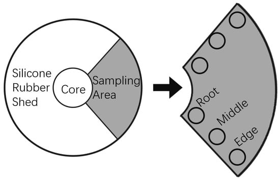In the operation of composite insulators, the degree of influence from environmental factors such as sunlight, rainwater, contamination deposition, and electric field distribution varies at different positions of the umbrella skirt. As a result, tests conducted at different locations on the same sample may show significant differences. To improve the representativeness and accuracy of the test results, when testing composite insulators after they have been in service, 4 to 6 different locations are selected from each umbrella skirt for testing based on the skirt’s size. The sampling locations are chosen to cover the root, middle, and edge of the umbrella skirt as much as possible, as shown in Figure 1. For new composite insulator samples, since they have not yet been in operation and have not undergone uneven aging on the surface, only one random point on the surface is selected for testing.
