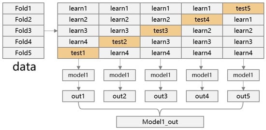 Additionally, by selecting different types of algorithms, the approach ensures that their prediction results are complementary, reducing the bias and variance associated with a single model. The cross-validation process for the base learners is illustrated in Figure 5.