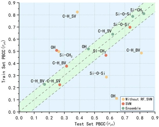 In the figure, the green points represent the ensemble model excluding SVM and RF, the blue points represent the optimized SVM model among the base learners, and the orange points represent the model proposed in this study. The green region indicates the absence of overfitting, while the blue region suggests the potential occurrence of overfitting. It can be observed that most of the features in the proposed model are distributed near the main diagonal within the green region, indicating that the model performs consistently across both the training and testing sets. In contrast, the points for the model excluding SVM and RF deviate significantly from the main diagonal, with the SVM model’s points, particularly those for the hydroxyl group, deviating more drastically. This suggests that the model may have difficulty correctly learning the aging pattern associated with a single functional group, such as the hydroxyl feature, which aligns with the fact that the aging of silicone rubber cannot be easily discerned from the changes in any single functional group alone. The complex and multifaceted nature of silicone rubber aging means that relying on a single feature’s variation is often insufficient to capture the full scope of degradation.