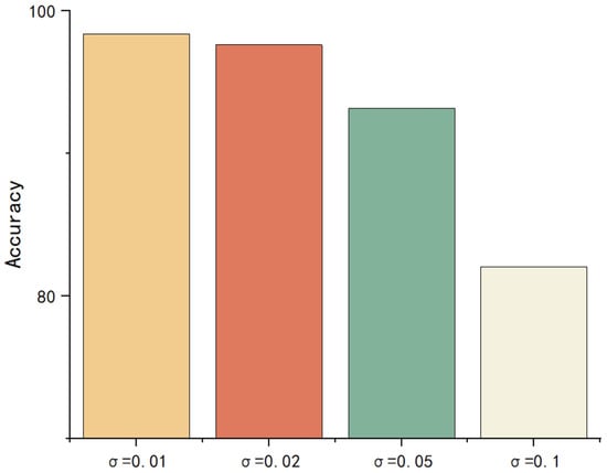 It can be observed that the model maintains excellent predictive performance when the noise standard deviation, , does not exceed 0.05. When increases to 0.1, the model’s accuracy experiences a significant decline, but it still remains above 80%. This suggests that despite the increased noise intensity, the model retains strong robustness and is capable of effectively resisting a certain level of noise interference. This result further validates the model’s stability in the face of disturbances of varying intensities, demonstrating its ability to adapt to fluctuations in data quality in practical applications.