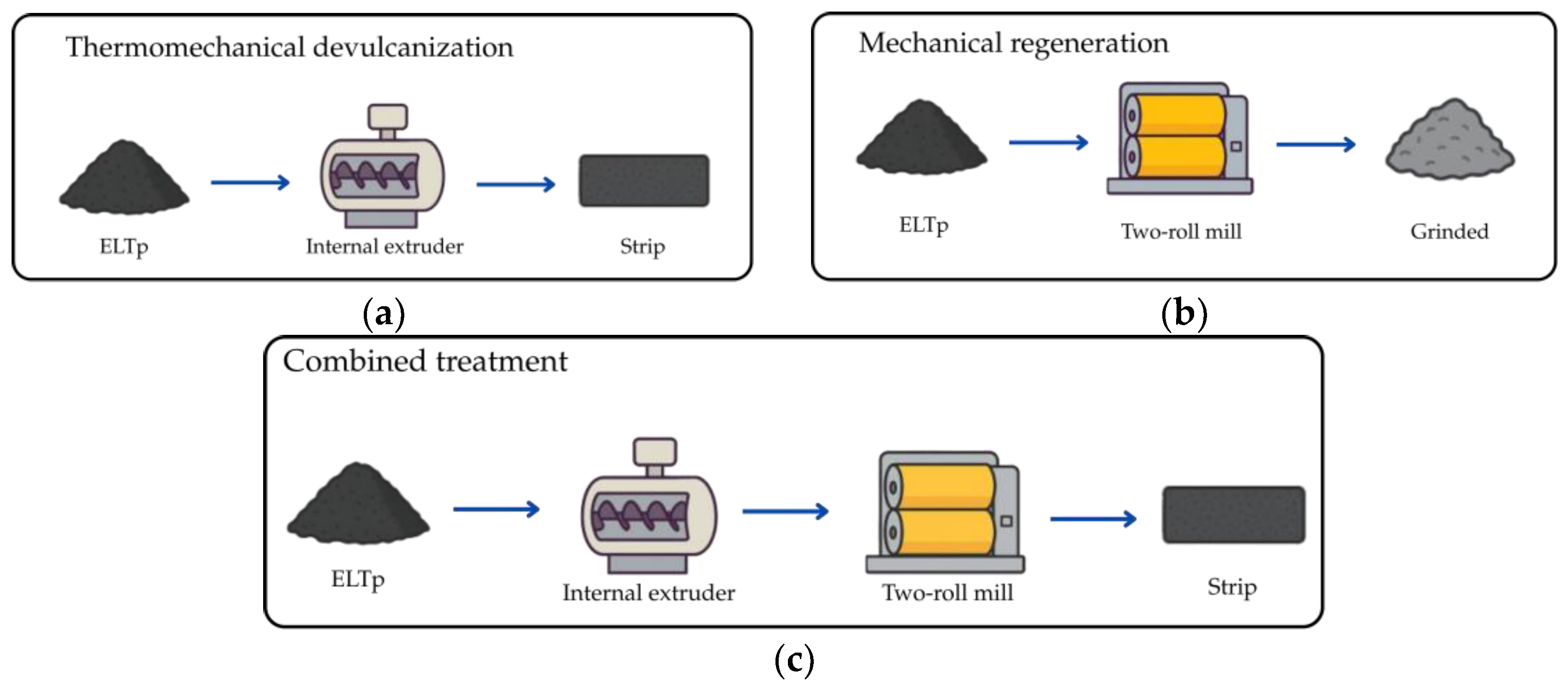 In those samples, ELTp and ELTp-B were used to study the effect of adding bitumen to the ELT powder (ELTp-B) on the mechanical properties of the prepared TPVs. Additionally, in order to evaluate the effect of different rubber recycling processes, the same recipes were used by replacing the raw ELTp and ELTp-B with those materials after regeneration and devulcanization treatments.