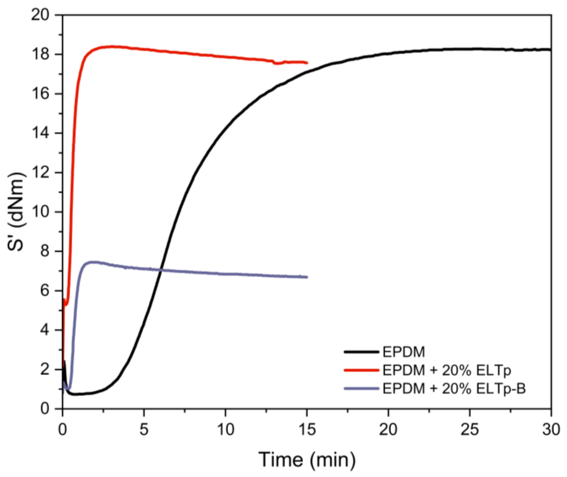 Initially, the rubber compounds were prepared in a two-roll mill. Initially, the mastication of EPDM allows the formation of a continuous rubber band. After that, ELTp or ELTp-B was added (except for the case of the virgin TPV that does not contain this ingredient) and mixed until optimal dispersion and homogenization were achieved. The subsequent ingredients were introduced in the following sequence: activators (ZnO and stearic acid), accelerators (TMTD and MBTS), and sulfur.