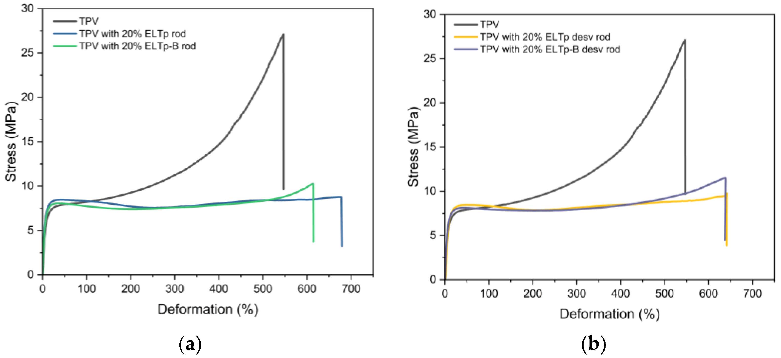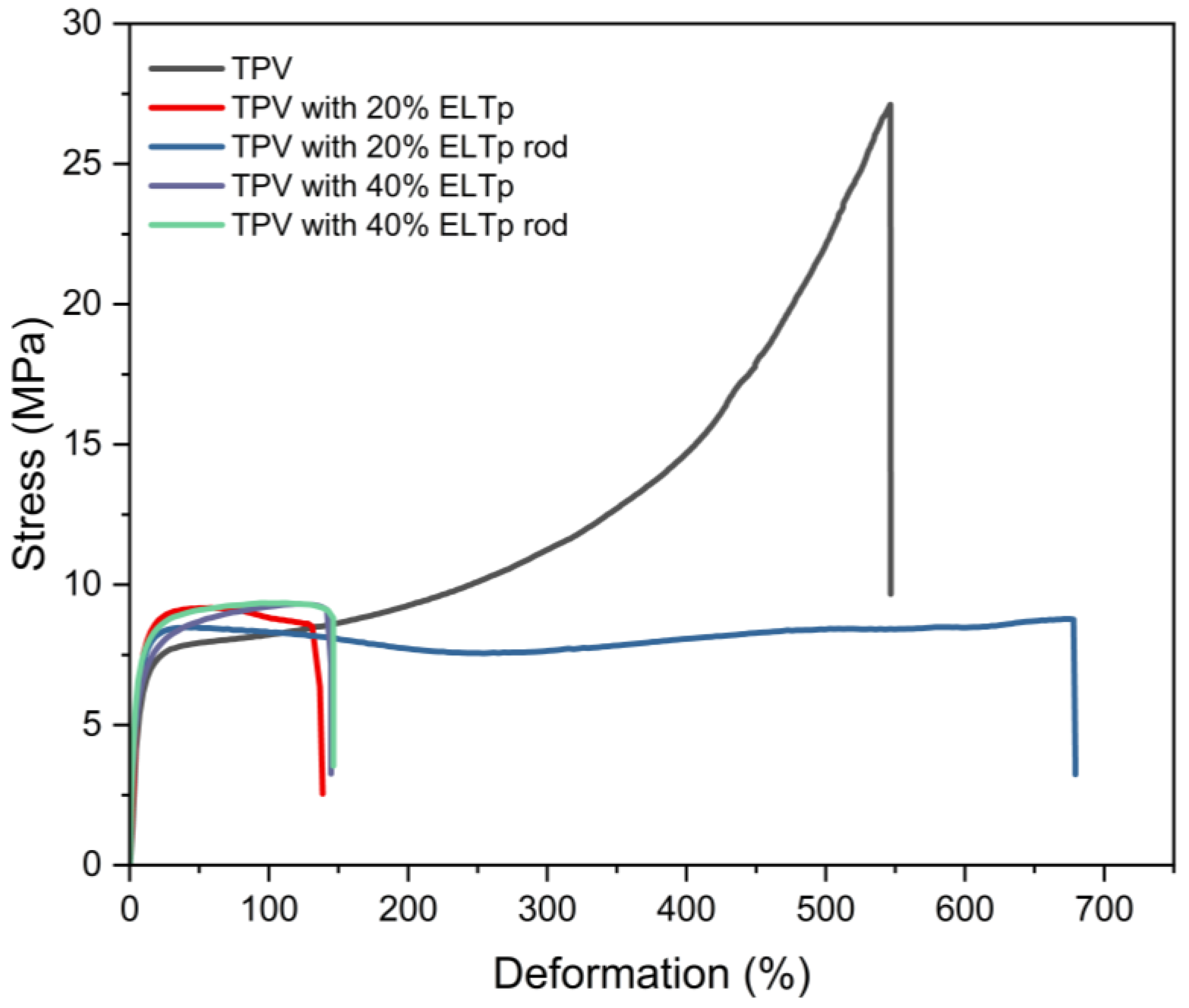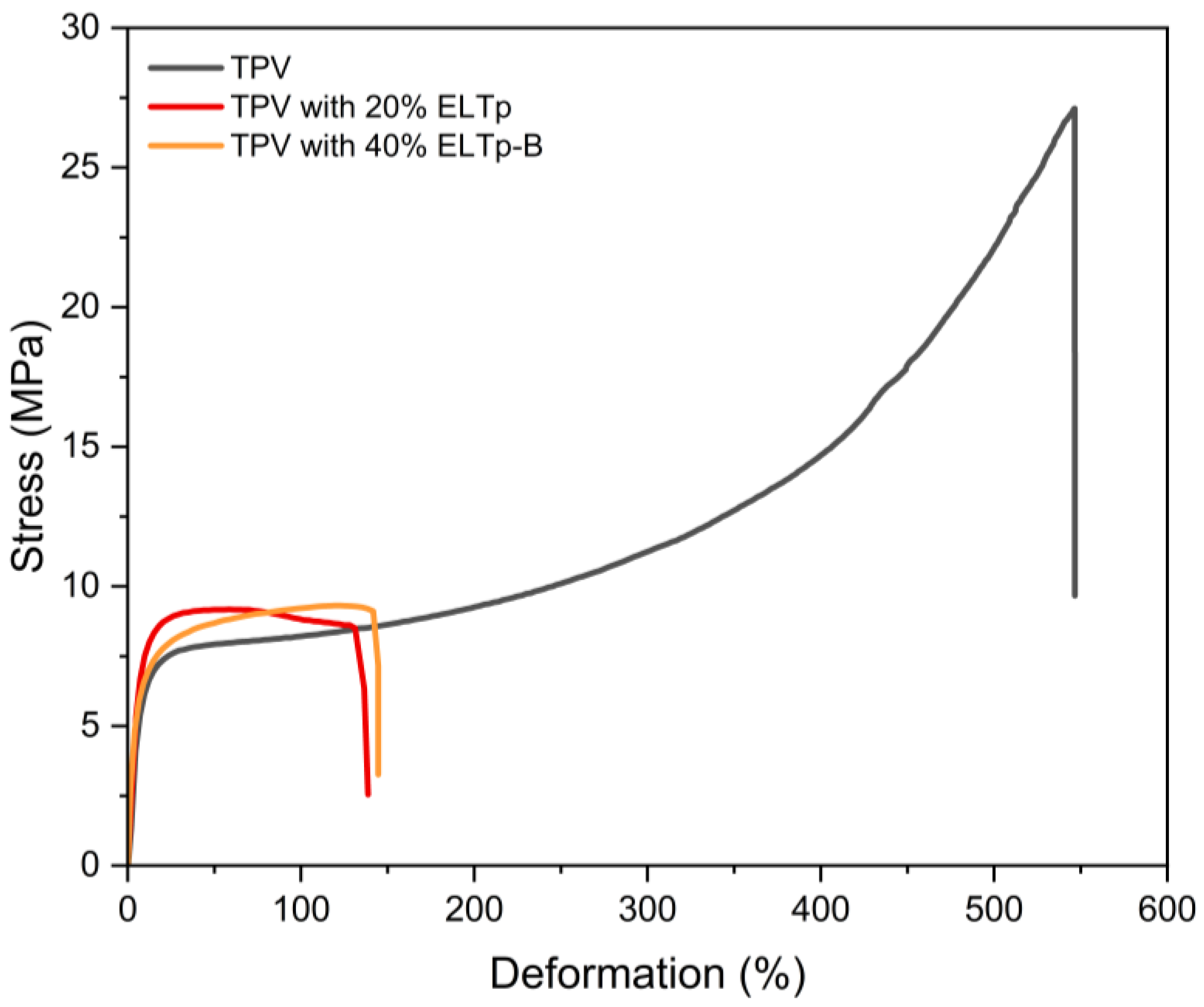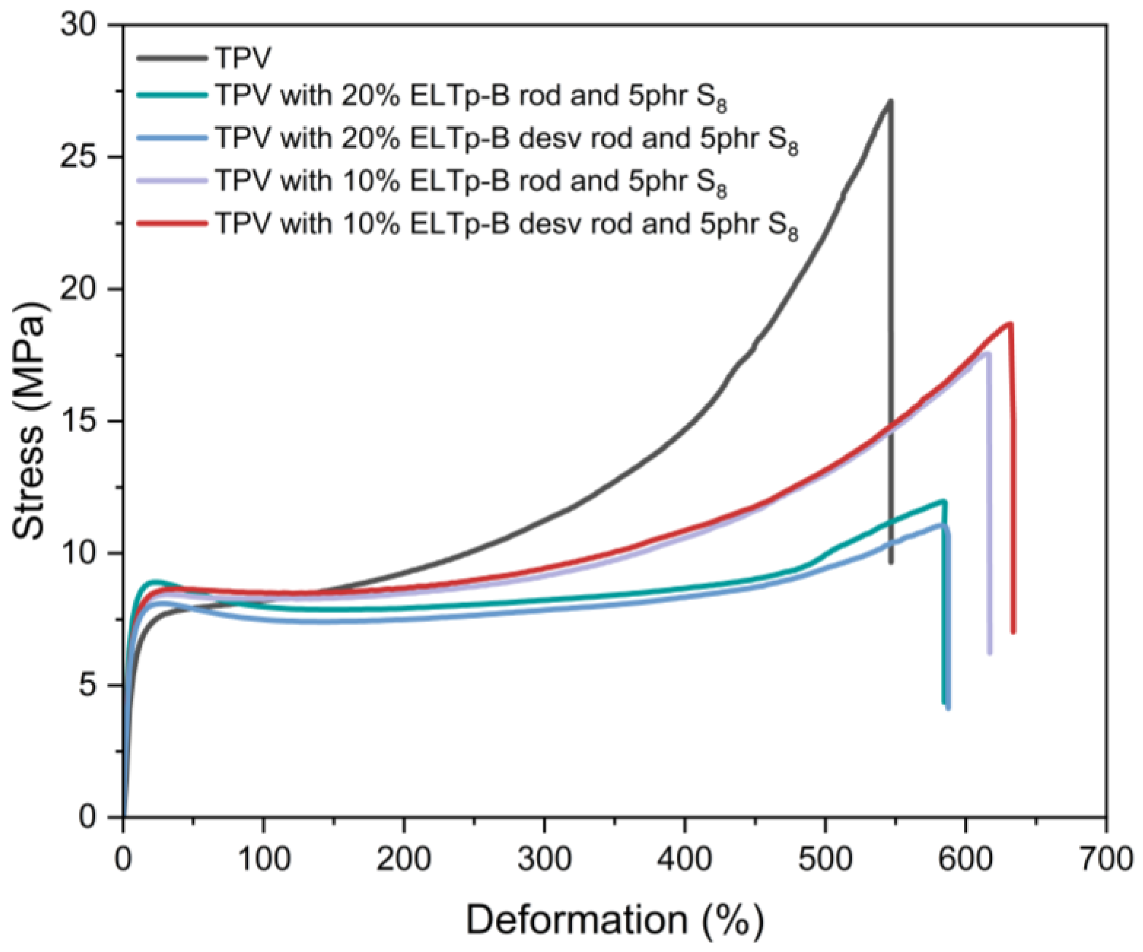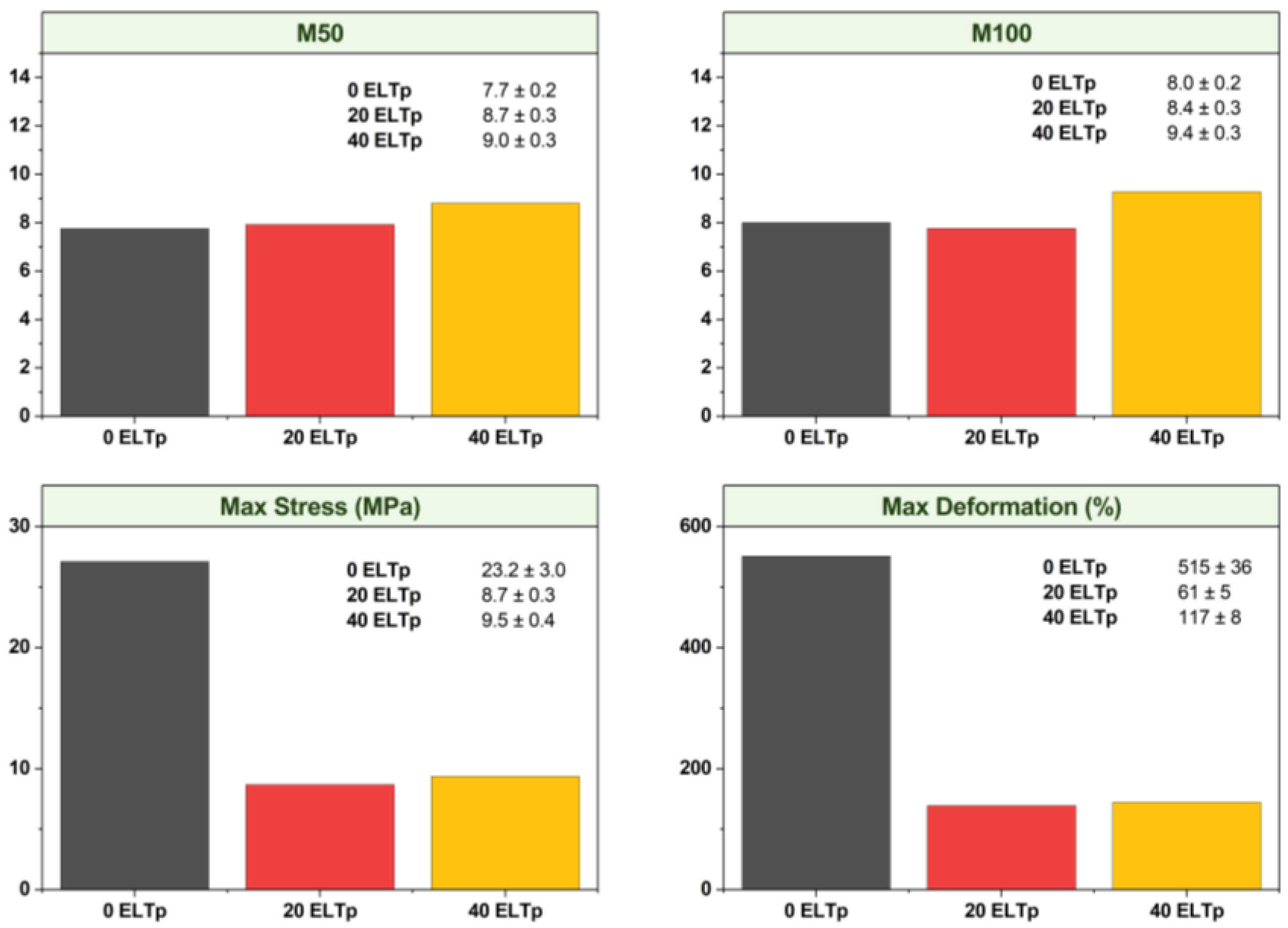 Finally, the tensile mechanical properties of the ELTp-B content were evaluated. In order to achieve this, the amount of ELTp-B with different treatments was reduced to 10% by weight of the total blend. Furthermore, the amount of the previous vulcanization system was maintained at a constant level, with the other ingredients adjusted as shown in