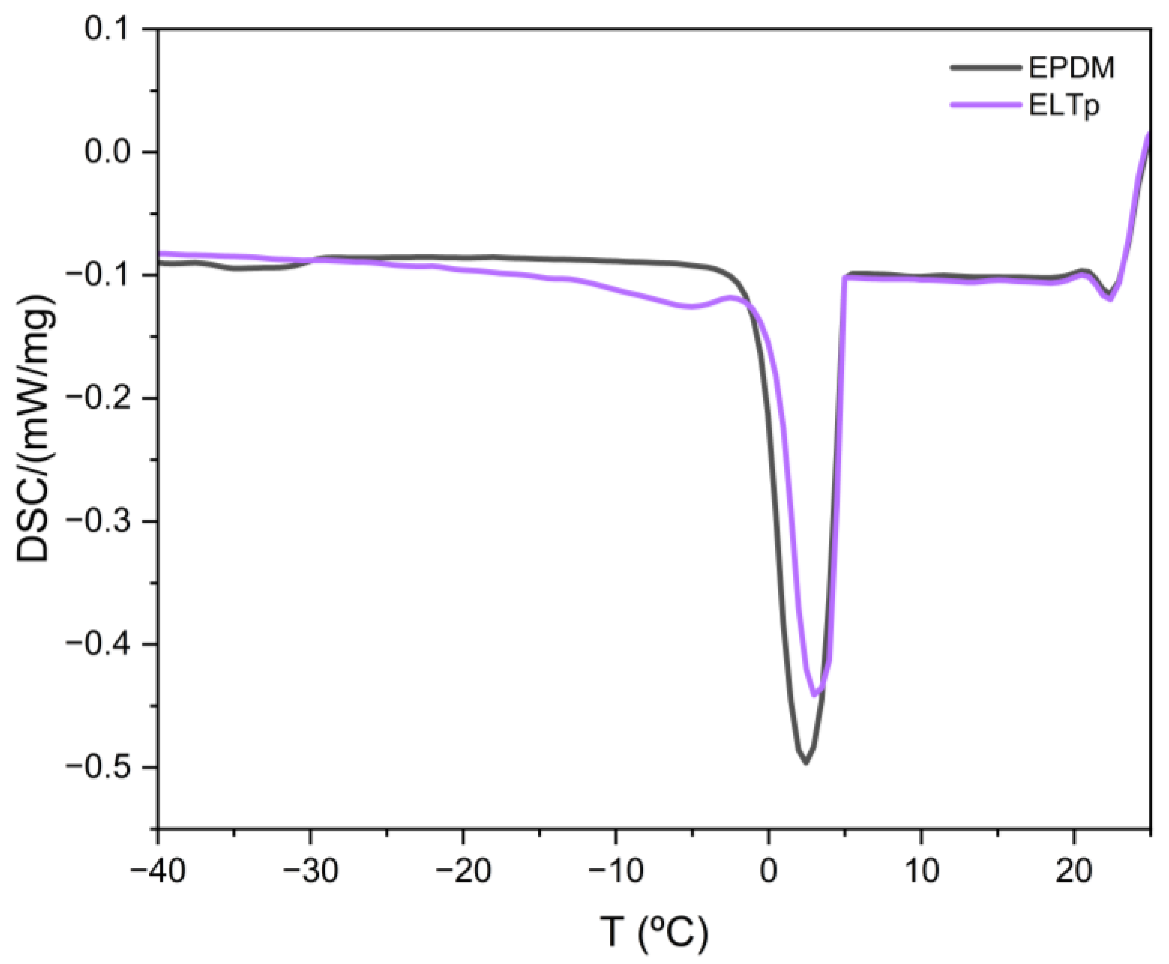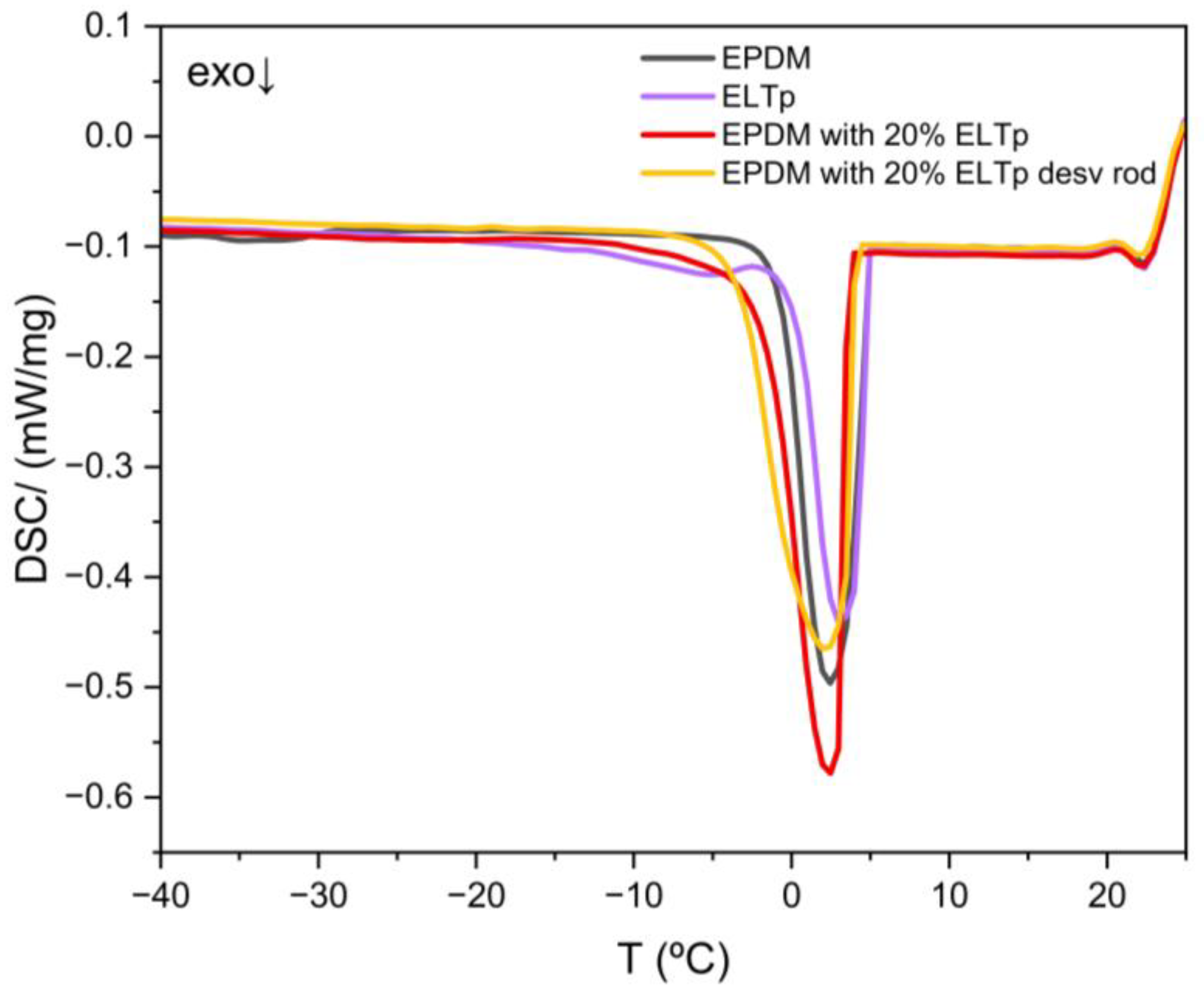 Additional differential scanning calorimetry analysis was performed to characterize the freezing-point depression of the solvent absorbed in the rubber compounds to estimate the formation of vacuoles and empty spaces at the rubber interface (with fillers or with ELP-p). Vulcanized rubber samples with an approximate size of 5 mm