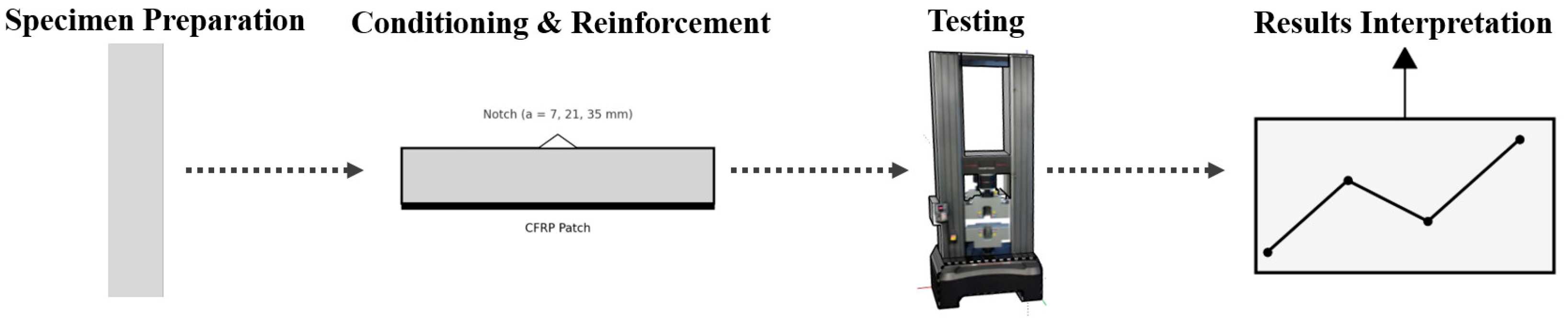 Schematic flowchart of specimen preparation, reinforcement, testing, and analysis steps.