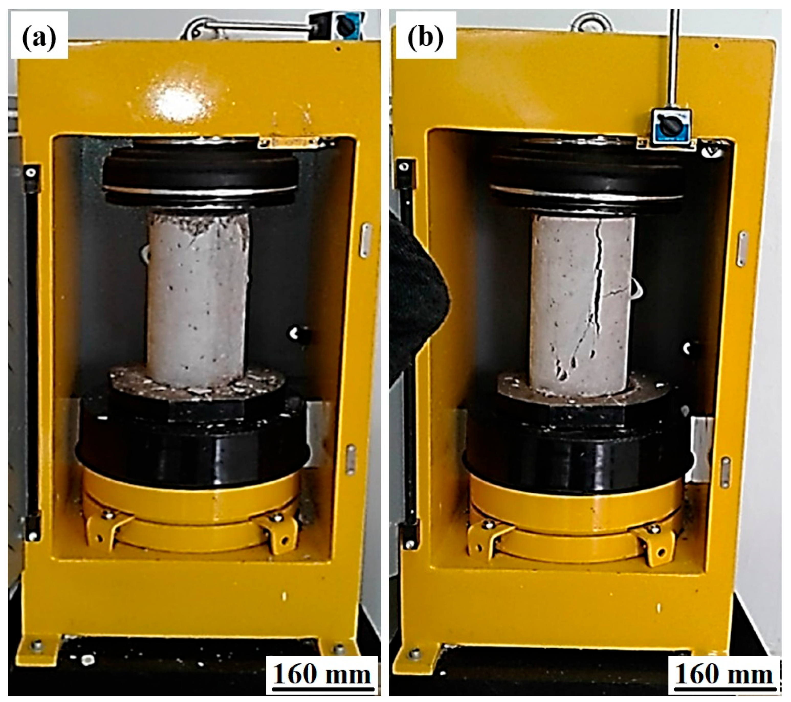 RP 3000 XP compression testing machine: (a) concrete specimens during compressive testing and (b) concrete specimens after the compression test.