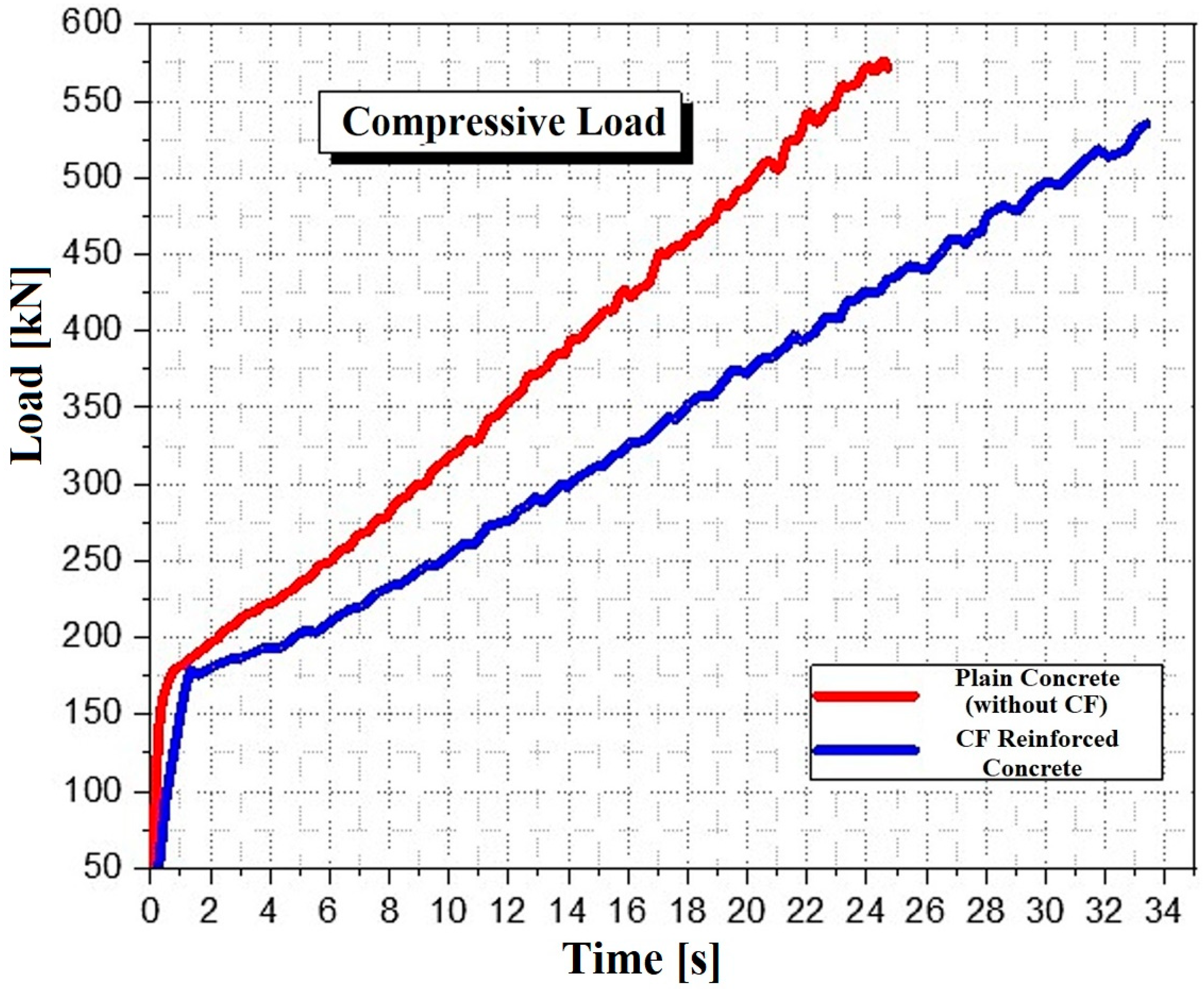 Compressive loading behavior of plain concrete and CF reinforced concrete.