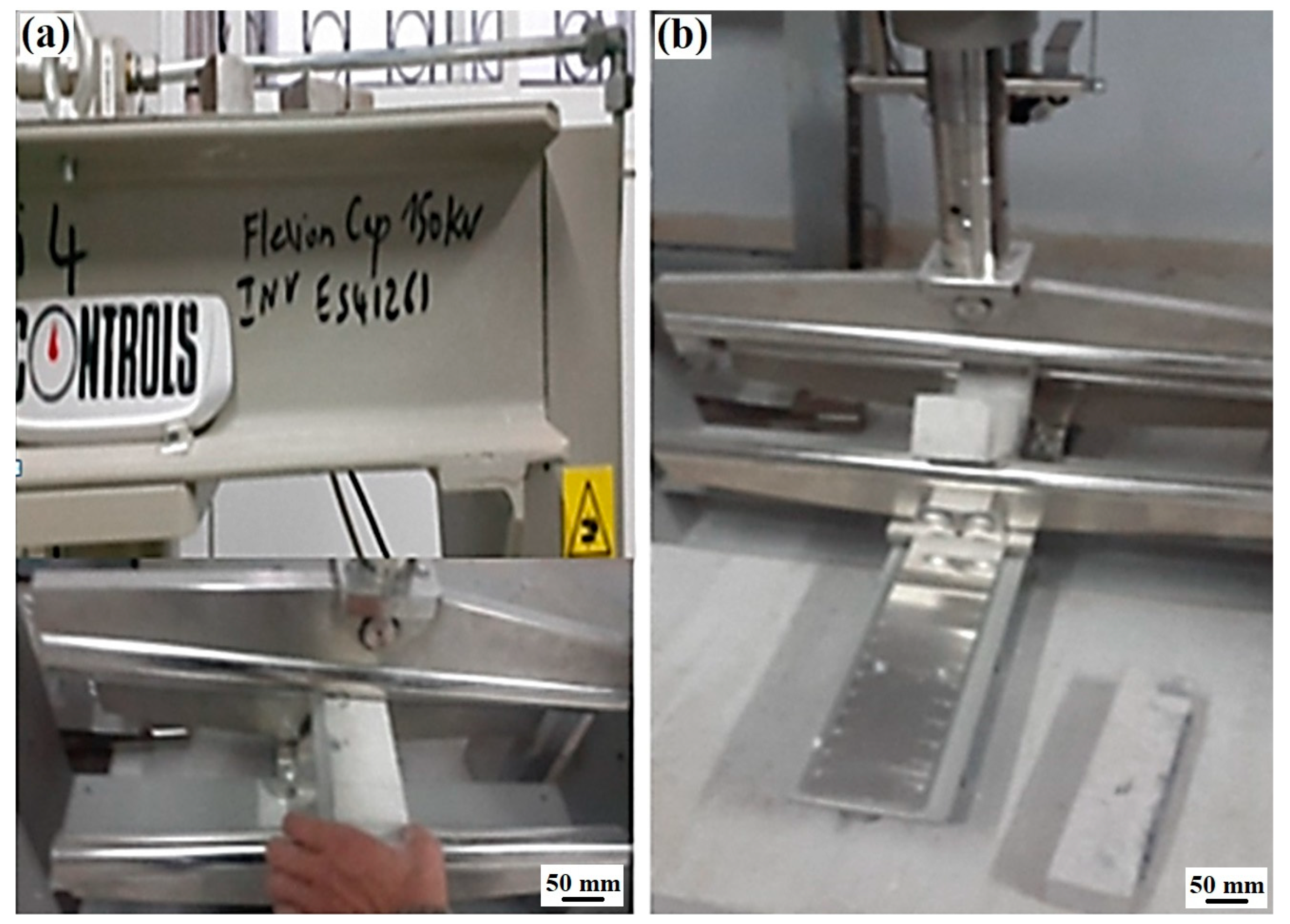 Bending testing machine on beam specimens: (a) specimen mounted in the bending beam creep tester and (b) view of specimen after flexural test.
