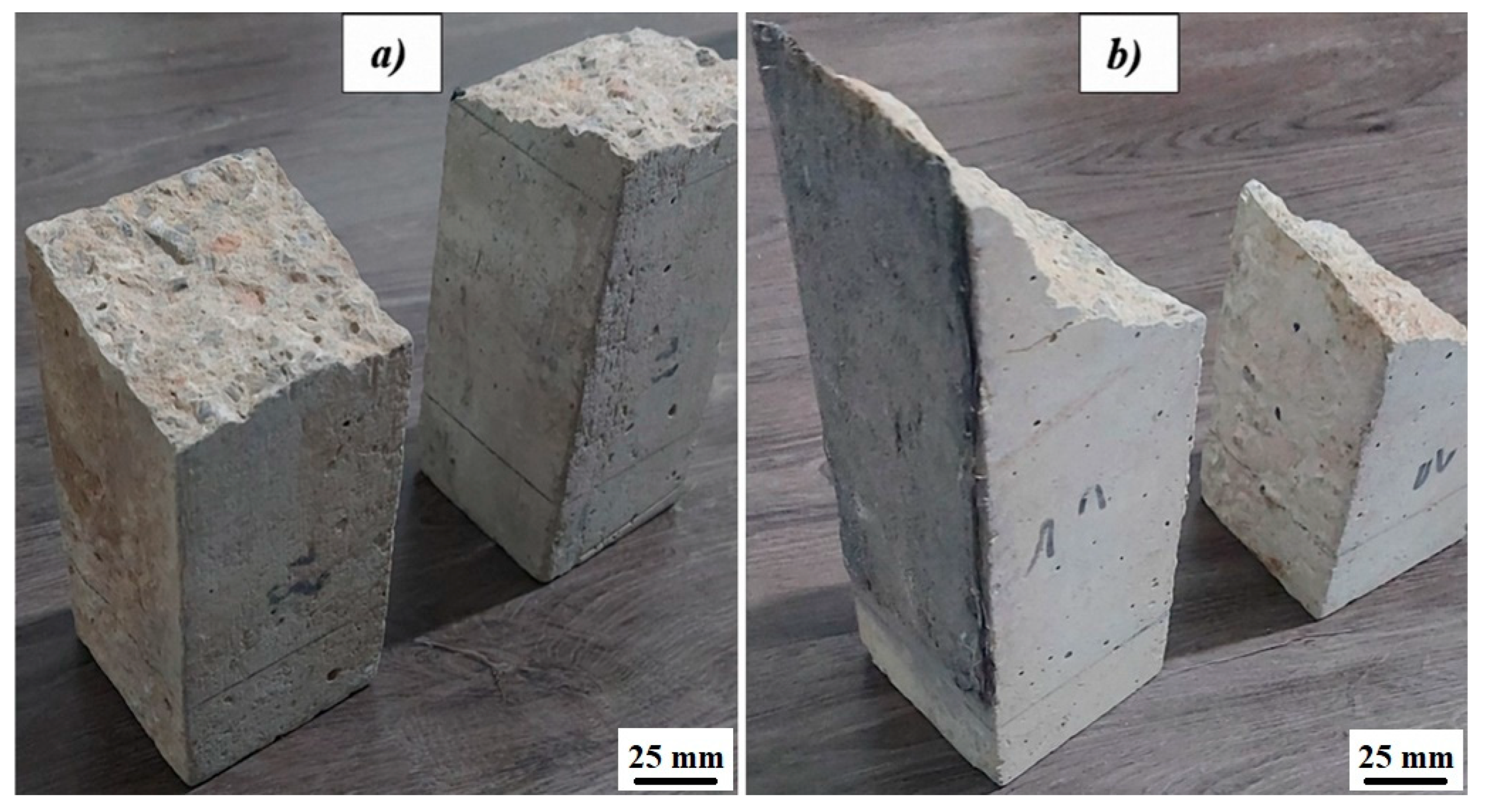 In this study, certain specimens were intentionally notched prior to testing in order to simulate pre-existing cracks and assess the effectiveness of carbon fiber-reinforced polymer (CFRP) patch reinforcement under controlled damage conditions. These notches were carefully and consistently introduced during the casting process by inserting a 1 mm thick plexiglass plate at the center of the mold, perpendicular to the longest axis of the prismatic specimens (7 cm × 7 cm × 28 cm). This method produced well-defined crack depths of 7 mm, 21 mm, and 35 mm, denoted in the manuscript by the variable a, with values expressed in millimeters. This setup ensured uniform crack geometry across all samples, which is essential for accurate and reproducible evaluation of the mechanical performance of both reinforced and unreinforced beams.