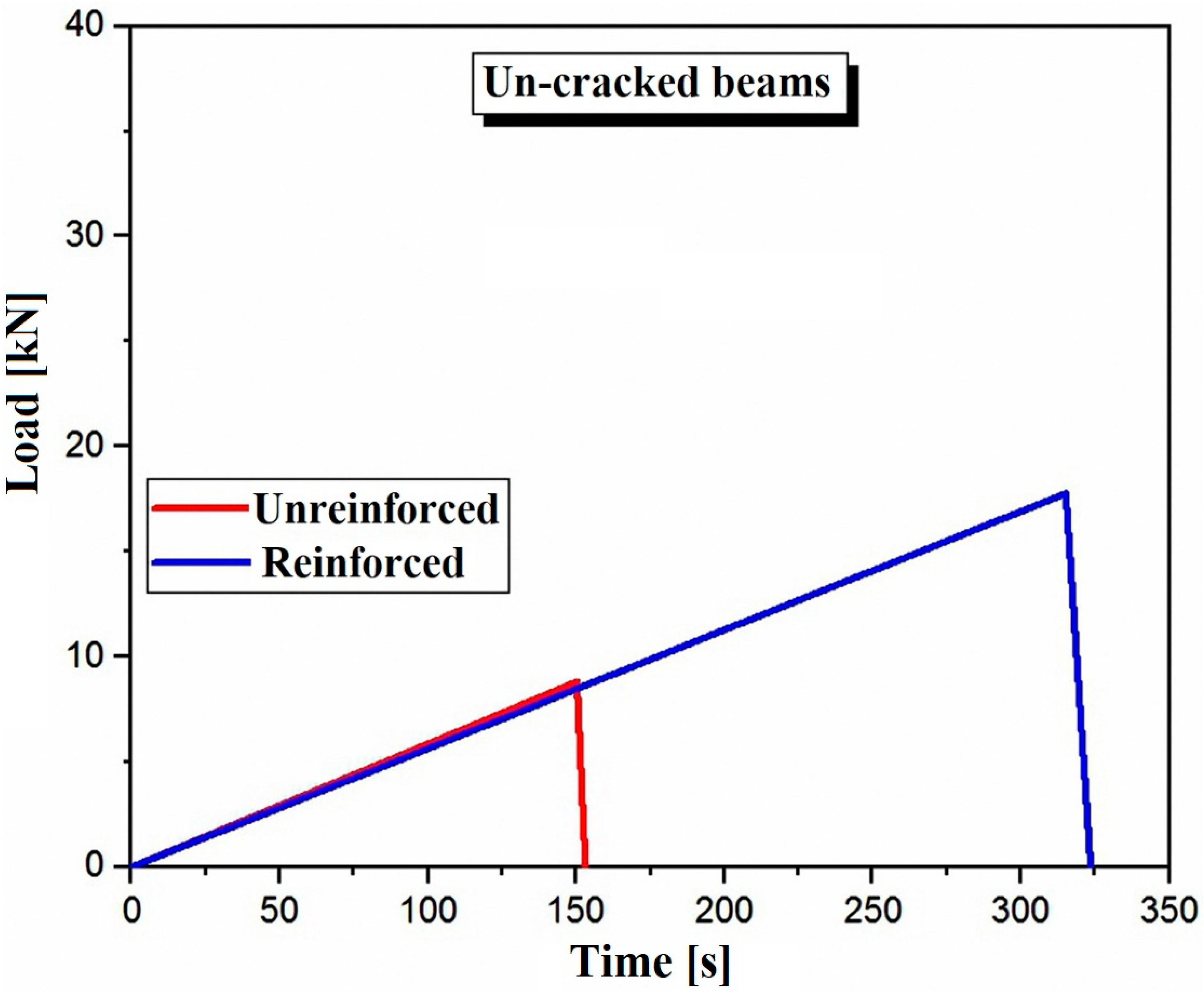 We observe a significant increase in the time to failure for the reinforced beam compared to the unreinforced beam. This increase can go as far as doubling the time to failure. For the reinforced beam, the ultimate load reaches 17.46 kN, while for the unreinforced beam, it is only 8.24 kN, approximately half of the value recorded for the reinforced beam.