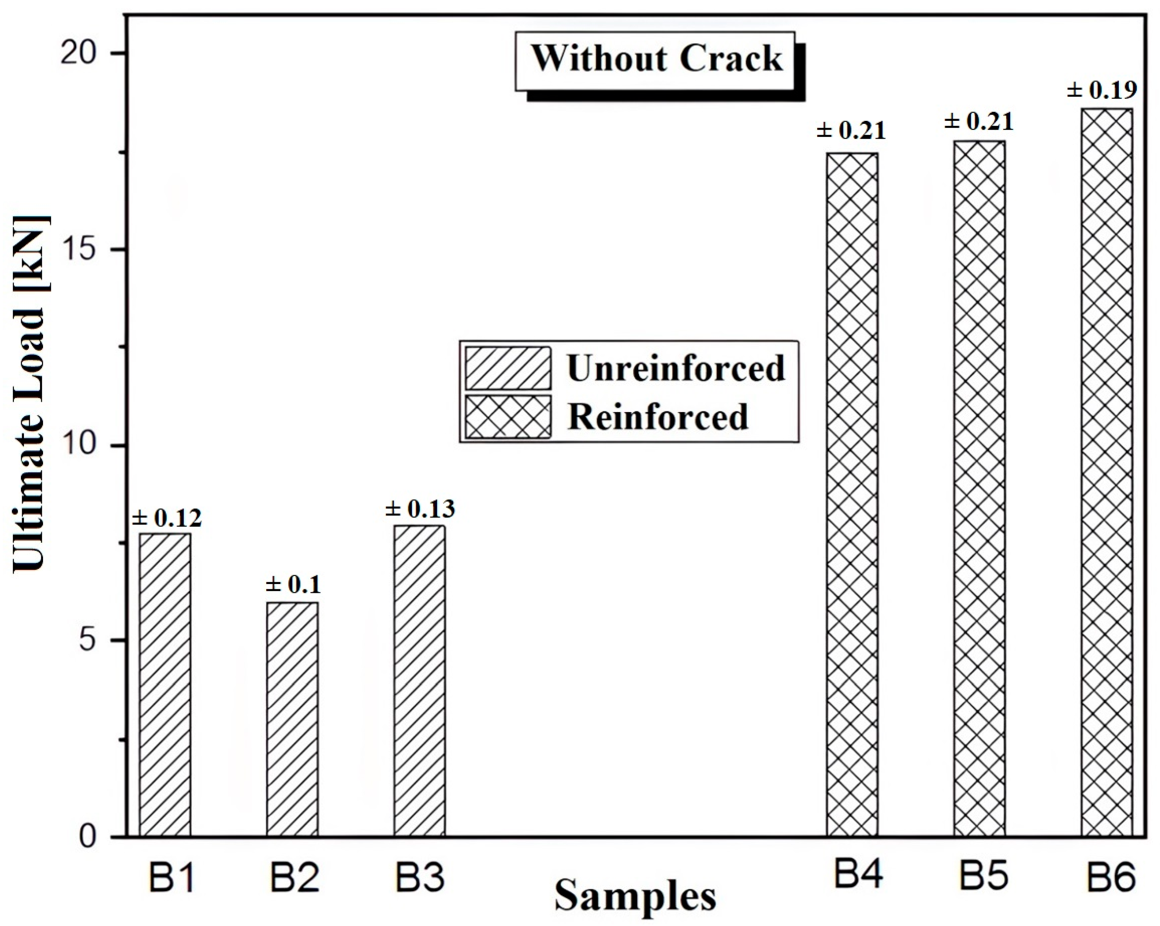 The previous figure (Figure 8) compares the cumulative ultimate load for series B1, B2, and B3, representing unreinforced and uncracked samples, series B4, B5, and B6, representing unreinforced uncracked specimens, and series B4, B5, and B6, representing reinforced uncracked specimens. According to this figure, it can be observed that for each specimen in series B, the ultimate load varies between 6.53 and 8.62 kN, whereas for specimens in series B, the ultimate load varies between 19 and 20.25 kN. In addition, reinforcement with CFRP patches significantly increases the ultimate load and consequently prolongs the lifespan of the reinforced structure. As a result, the ultimate load recorded for the reinforced specimens is higher than that of the unreinforced specimens, reaching up to 200%.