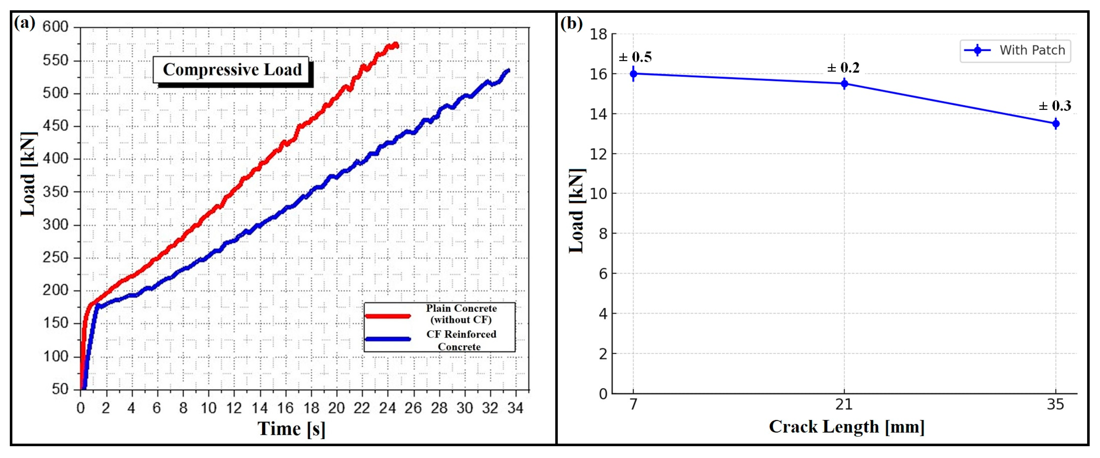 (a) Load–time curves of plain and CF-reinforced concrete, (b) ultimate load versus crack length for repaired beams with error bars.