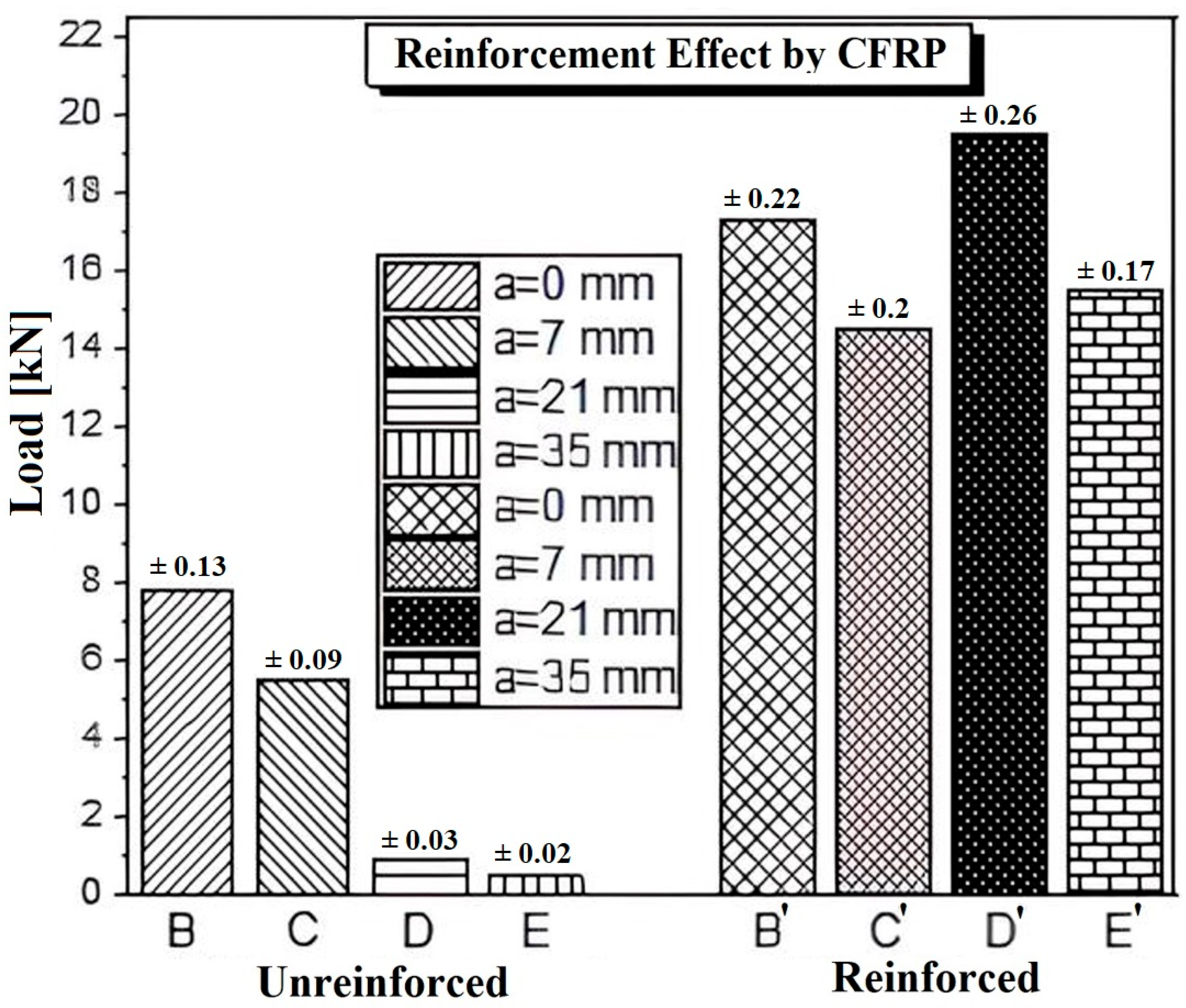As shown in Figure 11, the length of cracks in specimens repaired with carbon fibers appears to influence the material’s ability to distribute loads and limit crack propagation. Shorter cracks enable better adhesion and force transmission, whereas longer cracks reduce the effectiveness of the repair if load transfer is not adequately ensured. Based on the results, CFRP reinforcement remains effective for cracks of 7 mm and 21 mm, but its contribution becomes less significant at around 35 mm, where the reinforcement effect is limited.