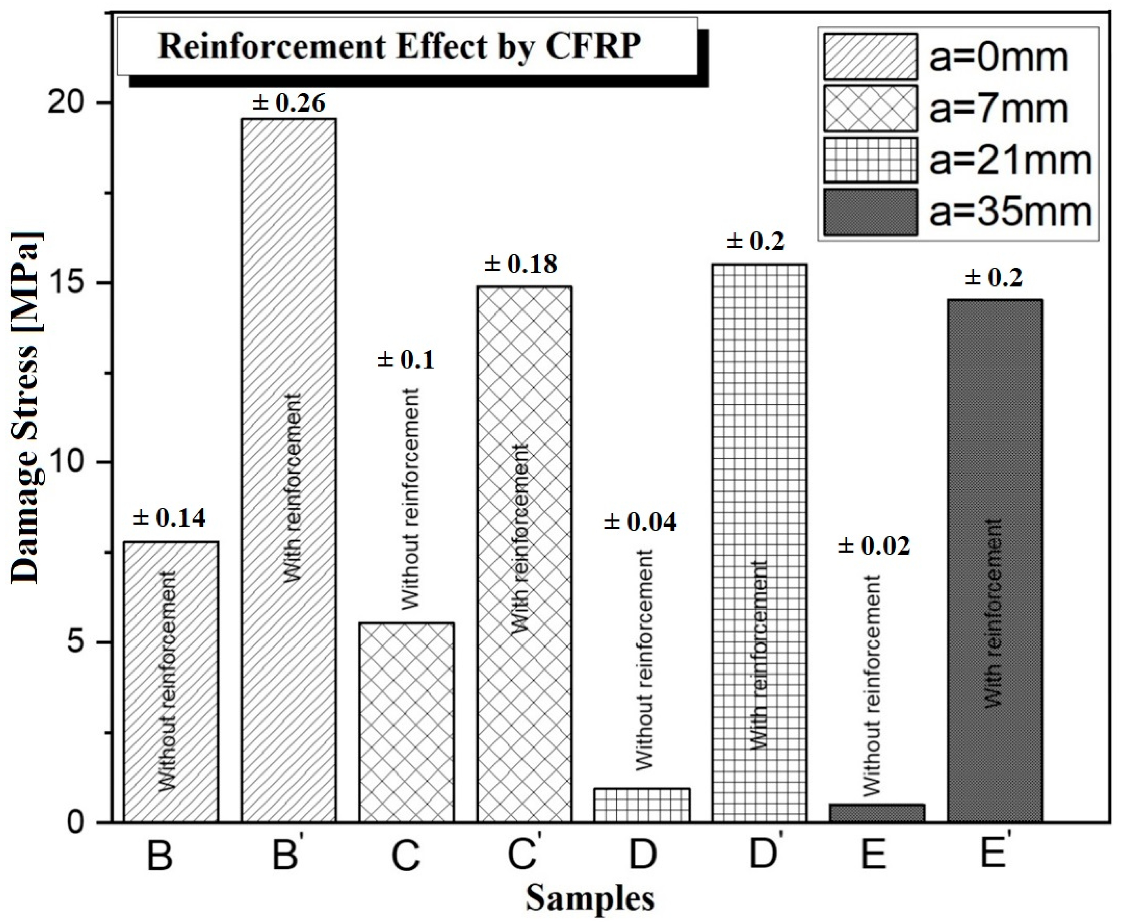 Comparison of damage stress for unreinforced and CFRP reinforced beams with different crack depths.