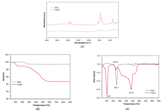 (a) TEM images (left), (b) SEM images (right), (c) ATR-FTIR spectra, (d) TGA curves, and (e) DTG trends of ZnO and f-ZnO.