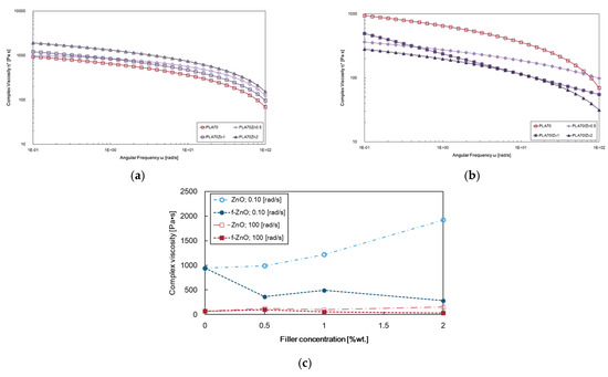 Complex viscosity curves of PLA/PA11 = 70/30 w/w (named “PLA70” in the figure) and materials containing (a) ZnO and (b) f-ZnO at different concentrations as a function of frequency; (c) complex viscosity values at 0.1 rad/s and 100 rad/s.