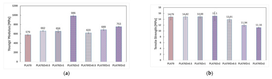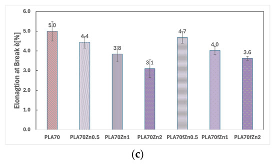 Main mechanical properties: (a) Young’s modulus, E, (b) tensile strength, TS, and (c) elongation at break, EB, of PLA/PA11 = 70/30 w/w (named “PLA70” in the figure) and materials containing ZnO and f-ZnO at 0.5, 1, and 2 wt.%.