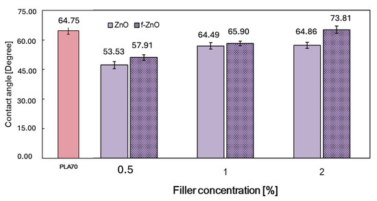 Water contact angle (WCA) measurements of PLA/PA11 = 70/30 w/w (named “PLA70” in the figure) and materials containing ZnO and f-ZnO at 0.5, 1, and 2 wt.%.