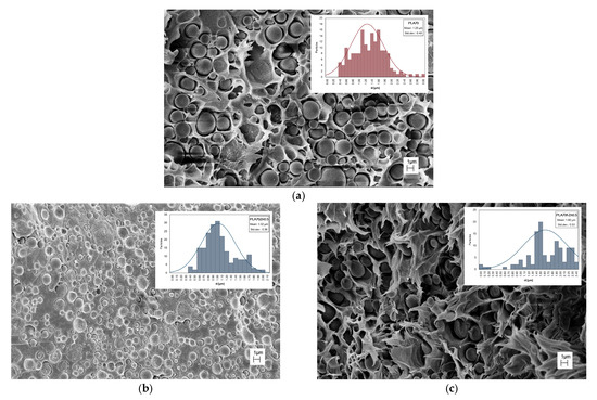 SEM observations and the inserts show the distribution of PA11 particle dimensions of (a) PLA/PA11 = 70/30 w/w and materials containing (b) ZnO at 0.5 wt.% and (c) f-ZnO at 0.5 wt.%.