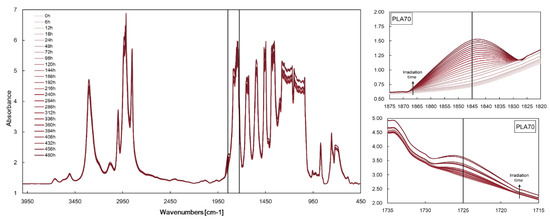 FTIR spectra (left) of PLA/PA11 = 70/30 w/w at different exposure times and selected zones in FTIR spectra (right), e.g., height of peaks at 1845 cm−1 and 1725 cm−1 at different exposure times.