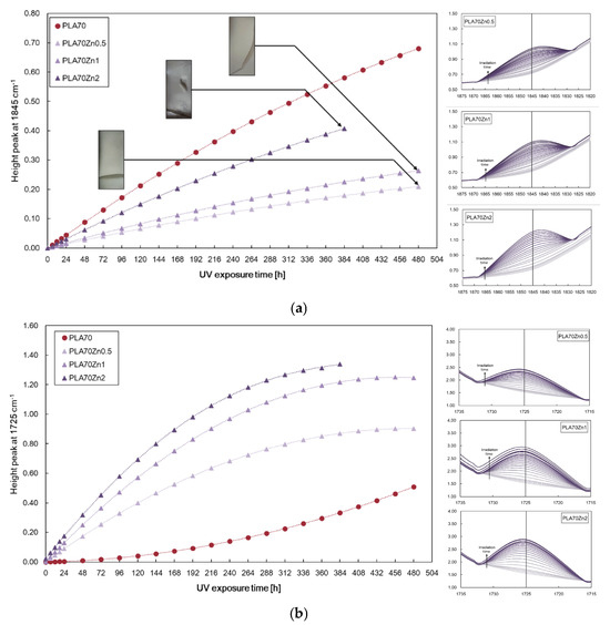 Height of peaks at (a) 1845 cm−1 and (b) 1725 cm−1 for PLA/PA11 = 70/30 w/w and films containing 0.5, 1, and 2 wt.% ZnO at different exposure times.