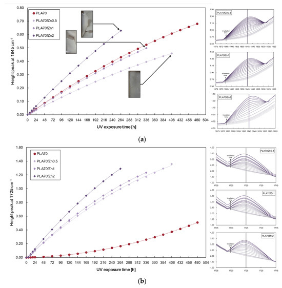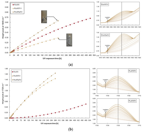 However, the progress of photo-oxidation of PLA/PA11 blends can be profitably monitored following both the accumulation of anhydride functions (peak at 1845 cm−1), due to the PLA photo-oxidation, and the accumulation of carbonyl functions (peak at 1725 cm−1), due to the PA11 oxidation. Figure 6 shows the FTIR spectra at different exposure times (left) and selected zones in FTIR spectra (right), e.g., height of peaks at 1845 cm−1 and 1725 cm−1 at different exposure times. Both heights of peaks at 1845 cm−1 and 1725 cm−1 increase with increasing UBV exposure time.