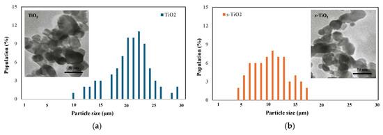 To investigate the effect of sonication on the particle size of TiO2, the particle size dimensions of both untreated and sonicated TiO2 (s-TiO2) were estimated by analysing TEM images. It appears that TiO2 exhibits the largest particle population at 20–22 µm, which is supported by the literature [36]. After sonication, this population is approximately half the size, i.e., around 10–12 µm, indicating the formation of smaller particles, as shown in Figure 9b.
