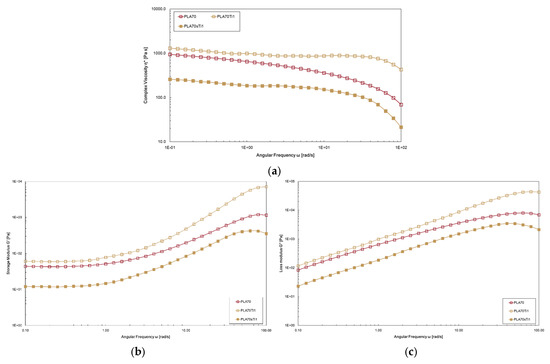 Rheological tests were performed using a stress-controlled rheometer (ARES G-2) in parallel plate geometry (plate diameter 25 mm). The complex viscosity (η*), storage (G′), and loss (G″) moduli were measured under frequency scans from ω = 0.1 to 100 rad/s at T = 170 °C. The strain amplitude was γ = 5%, which preliminary strain sweep experiments proved to be low enough to be in the linear viscoelastic regime.