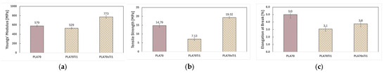 Main mechanical properties: (a) Young’s modulus, E, (b) Tensile strength, TS, and (c) Elongation at break, EB, of PLA/PA11 = 70/30 w/w (named “PLA70” in the figure) and materials containing TiO2 and s-TiO2 at 1 wt.%.