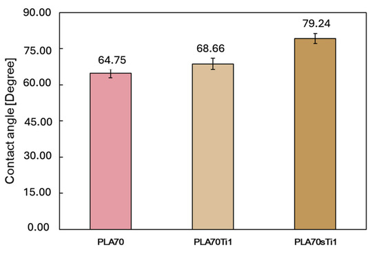Water contact angle (WCA) measurements of PLA/PA11 = 70/30 w/w (named “PLA70” in the figure) and materials containing TiO2 and s-TiO2 at 1 wt.%.