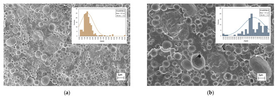 SEM observations and the inserts show the distribution of PA11 particle dimensions of PLA/PA11 = 70/30 w/w containing (a) TiO2 and (b) s-TiO2 at 1 wt.%.