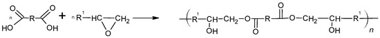 The crosslinking system used in the prepared propellants consists of CTPB (as the binder) and EHTPB (as the curing agent). The EHTPB employed contains approximately 30% epoxidized double bonds, which enables it to act as a crosslinker and effectively cure the final propellant mixture. Both components of the system were synthesized according to procedures available in the literature [22,23,24,25]. The reaction scheme for the curing process in the described system is presented below (Figure 2).