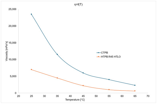 The viscosity changes of HTPB R45 HTLO and CTPB polymers as a function of temperature are shown in the figure below (Figure 3).