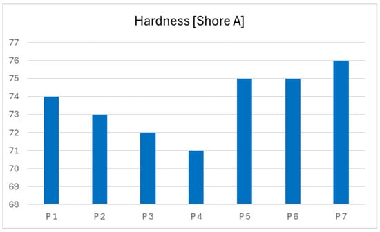 Hardness of the propellant provides insight into the degree of material curing. Abnormally low hardness values may indicate uncontrolled aging of the propellant, associated with plasticizer loss through diffusion and oxidation of the polymer matrix. Significant variation in hardness measurements across a single sample may suggest surface heterogeneity caused by component migration within the grain or chemical interactions between individual ingredients [28].