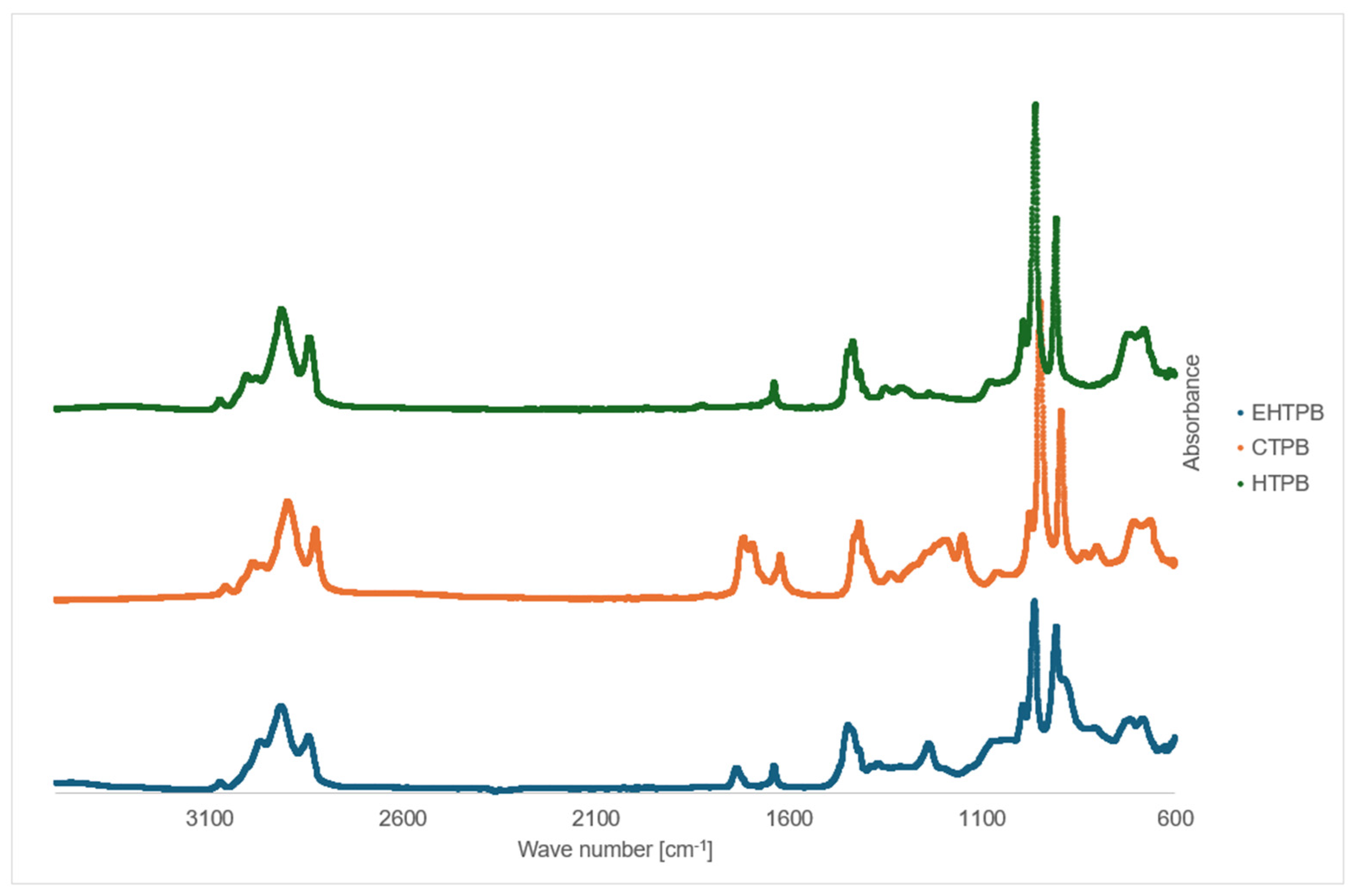 The FTIR spectrum (Figure 5) obtained for HTPB shows absorption bands in the range of 3100–2800 cm−1, corresponding to the stretching vibrations of hydroxyl groups, as well as a band at 1640 cm−1 associated with the stretching vibrations of C=C double bonds. When comparing the spectra of both prepolymers, the FTIR spectrum of CTPB reveals distinct bands attributed to the stretching vibrations of C=O bonds in the range of 1780–1650 cm−1, along with a peak corresponding to C–O vibrations between 1300–1150 cm−1. This indicates the presence of ester and carboxyl groups in the analyzed compound, confirming the successful synthesis of CTPB.