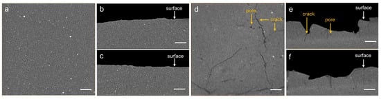 The reconstructed tomogram slices of the fresh insulator and the field-serviced insulator. Top view (a) and side views (b,c) of the fresh insulator. Top view (d) and side views (e,f) of the field-serviced insulator. Pores and cracks (pointed by orange arrows) could be easily found in the field-serviced insulator. The silicone rubber matrix is shown in gray, inorganic fillers in white, and pores/cracks in black. The scale bars are 100 μm.