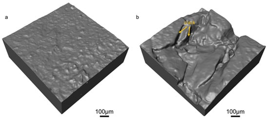 X-ray micro-CT is a non-destructive imaging technique that helps obtain 3D structural information []. The equipment used in this study was an X-ray micro-CT instrument (Zeiss Xradia 520 Versa, Zeiss, Oberkochen, Germany) operated at a voltage of 80 kV with a power of 7 W. During the tomographic scanning process, the samples were rotated 180°. A total of 2201 projections were acquired for each 3D tomographic scan with an exposure time of 3 s for each projection. The pixel size of the obtained images was 3.5 μm for both samples, and the minimum distinguishable pore/crack width was approximately 2–3 voxels. With the above-mentioned setup, each scan took approximately 2 h. The source–sample distance was −8.59, and the sample–detector distance was 30.51; the source filter was LE1. For reconstruction, the algorithm was Auto CB, the voxel pitch was associated with the 4X objective and binning 2 (corresponding to a resolution related to 3.5 μm, as indicated by the recipe point name), beam-hardening and ring-artifact corrections were implicitly addressed by the Auto CB reconstruction and multi-reference collection, and phase retrieval was not employed. The samples were vertically fixed on the sample stage with hot-melt adhesive—specifically, the surface normal of the samples was kept perpendicular to the rotation axis of the CT scan.