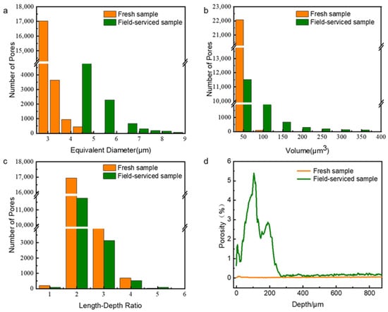 The distribution of the pore volumes is shown in Figure 4b. In the fresh insulator, the volume of almost all the pores is less than 50 μm3, while in the field-serviced insulator, the pore volume significantly expands to a range of 50 to 150 μm3. Additionally, Figure 4c illustrates that in both the fresh and field-serviced insulators, the length–depth ratio of the pores exceeds 1, which indicates that pore expansion occurs more prominently in the surface direction than in the depth direction. This is because that the surface of the sample is directly exposed to the environment and is subjected to more complex forces, resulting in more significant expansion of pores or cracks along the surface direction [,].