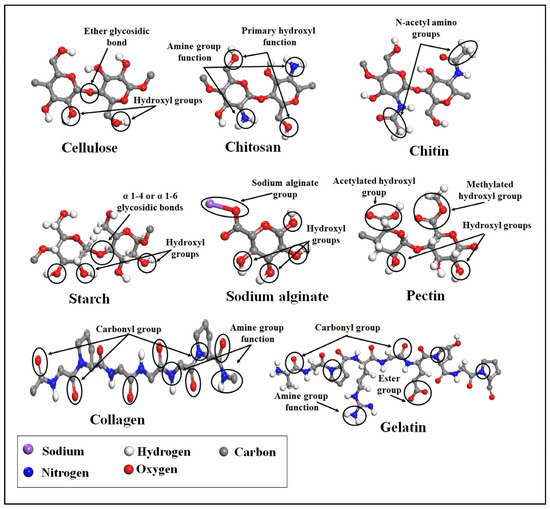 Molecular structures and key functional groups of major naturally derived biopolymers commonly used in biomedical and drug delivery applications. Adapted with permission from [12].