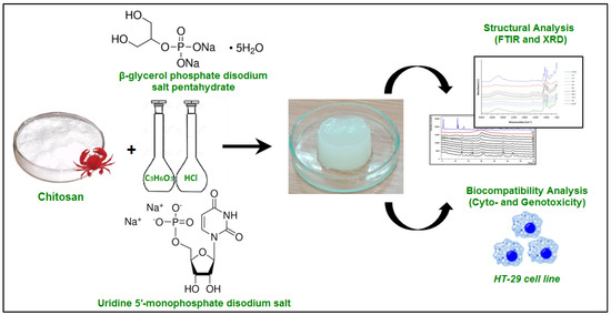Schematic illustration of the preparation and evaluation of thermosensitive chitosan-based material subjected to structural characterization; their biocompatibility was assessed through cytotoxicity and genotoxicity tests using the HT-29 human colon adenocarcinoma cell line. Adapted with permission from [45].