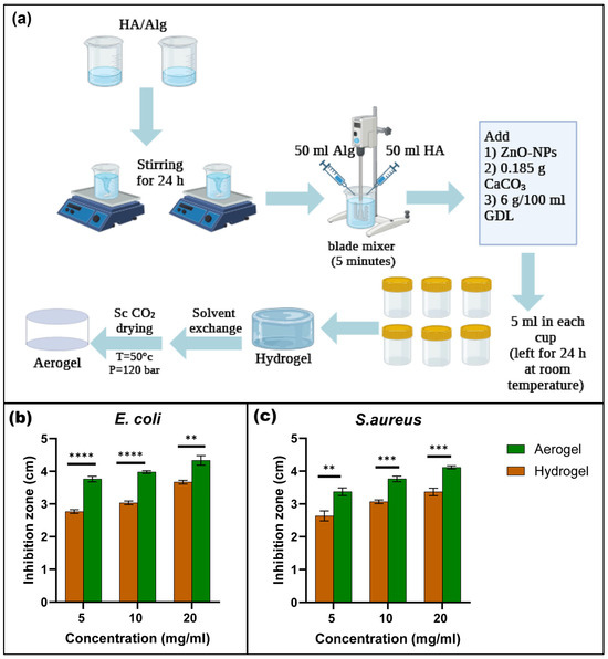 Illustration of the main steps of preparation of hyaluronic acid and alginate aerogel composites loaded with ZnO-NPs (a) and their antibacterial activity against Staphylococcus aureus (b) and Escherichia coli (c); Values represent mean ± standard deviation; asterisks denote statistical significance (** p < 0.01, *** p < 0.001, **** p < 0.0001). Adapted with permission from [59].