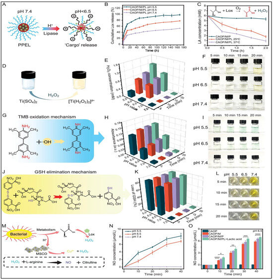 Schematic illustration of functional characterization of a smart hydrogel system. (A) pH/lipase-triggered drug release mechanism and (B) cumulative release profile. (C) Lactic acid scavenging. (D–I) Mechanisms and validation of self-supplying H2O2 and generating •OH. (J–L) Glutathione (GSH) depletion. (M–O) Bacteria-responsive nitric oxide (NO) cascade release. Data are mean ± SD; * p < 0.05, ** p < 0.01, *** p < 0.001, **** p < 0.0001. Adapted with permission from [82].