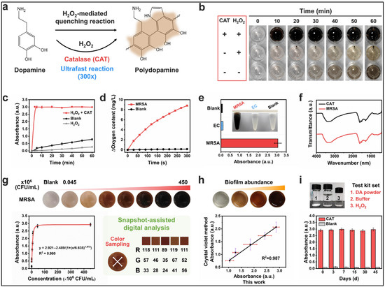 Ultrafast polymerization reaction-based detection of SA. (a) Schematic representation of the dopamine polymerization reaction catalysed by H2O2 and catalase, forming polydopamine. (b) Time-lapse images of dopamine polymerization under different conditions. (c) Absorbance measurements at OD652 showing reaction kinetics with various treatments. (d) Changes in oxygen content of H2O2 solution upon MRSA addition, recorded using a dissolved oxygen analyser. (e) Visual and spectroscopic detection of MRSA, with E. coli as a control. (f) FTIR spectra of polymerization products catalysed by MRSA and CAT. (g) Detection range of the MRSA-responsive polymerization reaction, validated through snapshot-assisted digital analysis. (h) Comparison of the proposed method with the conventional crystal violet staining for MRSA biofilm quantification. (i) Independent test kit for MRSA detection, demonstrating repeatability over multiple days. Adapted with permission from [94].