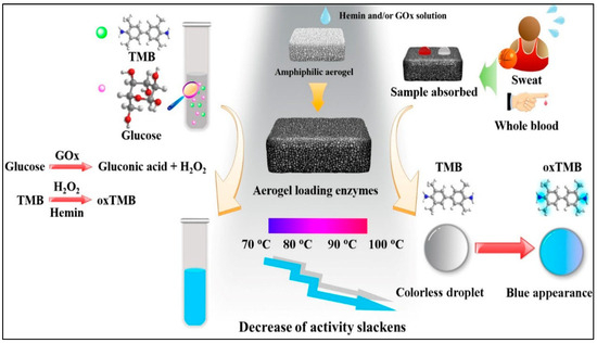 Beyond passive stimulus-responsive systems, externally triggered release mechanisms, such as magnetic, ultrasound, and light-responsive bioaerogels, offer another level of precision in drug administration [95,96]. These approaches allow for real-time control over drug release, making them particularly valuable for personalized medicine and on-demand therapeutic interventions [97]. Enzyme immobilization has gained significant attention in biocatalysis, biosensors, and industrial applications due to its ability to enhance enzyme stability and reusability [98]. However, free-floating enzymes often suffer from deactivation under harsh conditions, such as high temperatures, limiting their practical applications [99]. To address this challenge, researchers have explored various immobilization strategies, including the use of nanostructured materials and functionalized aerogels, to provide a stable microenvironment for enzyme retention and activity [100]. The authors investigated an amphiphilic poly(vinyl alcohol)-based aerogel as a substrate for multienzyme immobilization, aiming to enhance enzyme stability under extreme conditions. The aerogel, modified with maleic acid, improved surface wettability, facilitating efficient enzyme loading and stabilization (Figure 8). By co-immobilizing glucose oxidase and hemin within the aerogel matrix, the system successfully catalysed glucose oxidation and 3,3,5,5-tetramethylbenzidine oxidation while maintaining enzymatic activity at elevated temperatures (70–100 °C). The aerogel–enzyme composite demonstrated remarkable thermal stability, as evidenced by the reduced rate of enzymatic degradation under prolonged exposure to high temperatures. Furthermore, the modified aerogel was utilized as a glucose sensor, enabling accurate glucose detection in whole blood and sweat [100]. The composite material exhibited excellent adsorption capacity, catalytic efficiency, and mechanical durability, making it a promising candidate for biosensing applications. The study highlighted the potential of enzyme-loaded aerogels as robust platforms for biocatalytic processes and biosensors, offering enhanced enzymatic stability and functionality under extreme environmental conditions.