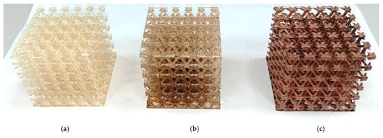 Lattice structures: (a) lattice structure printed from modified resin; (b) lattice structure immersed in an activator solution; (c) lattice structure with a copper coating applied.