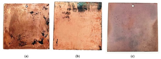 3D printing of polymer materials was conducted using an Anycubic Photon Mono M5s photopolymer 3D printer, featuring autoleveling, fast printing speeds of up to 105 mm/h, and smart control. Samples printed from the modified resin were activated in a 0.1 M silver nitrate solution for a predetermined time. After activation, the samples were rinsed with distilled water and dried, followed by chemical copper plating using electrolytes based on Rochelle salt and trilon copper complexes. The appearance of the samples after each step is shown in Figure 1. It is recommended to pre-dry the surfaces rather than allowing them to dry freely in the air, as uneven drying can create areas where droplets accumulate, resulting in uneven coating and potential discontinuities. Additionally, insufficient drying immediately before copper plating—due to residual moisture from the introduction of the modifying additive, washing, and sensitizer treatment—leads to a loose, non-glossy copper layer with a higher tendency to peel off.
