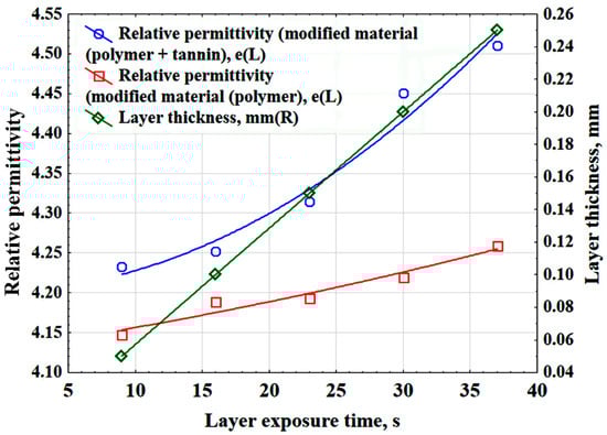 By developing a 3D printing technology for polymer materials and evaluating the impact of key process parameters on electrophysical properties and layer thickness, we plotted the relationships between relative permittivity and polymer layer thickness as functions of layer exposure time (Figure 8). Layer exposure time refers to the time during which ultraviolet light illuminates the resin in the printer vat to cure and form a single layer of the printed model. The figure demonstrates that incorporating tannin into the polymer matrix increases the relative permittivity.