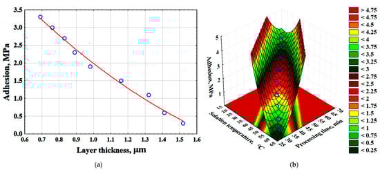 Effect of surface-modified layer thickness on adhesion (red line-average values of adhesion; blue dots are the values obtained as a result of the experiment)—(a); effect of time and temperature of the solution on adhesion—(b).
