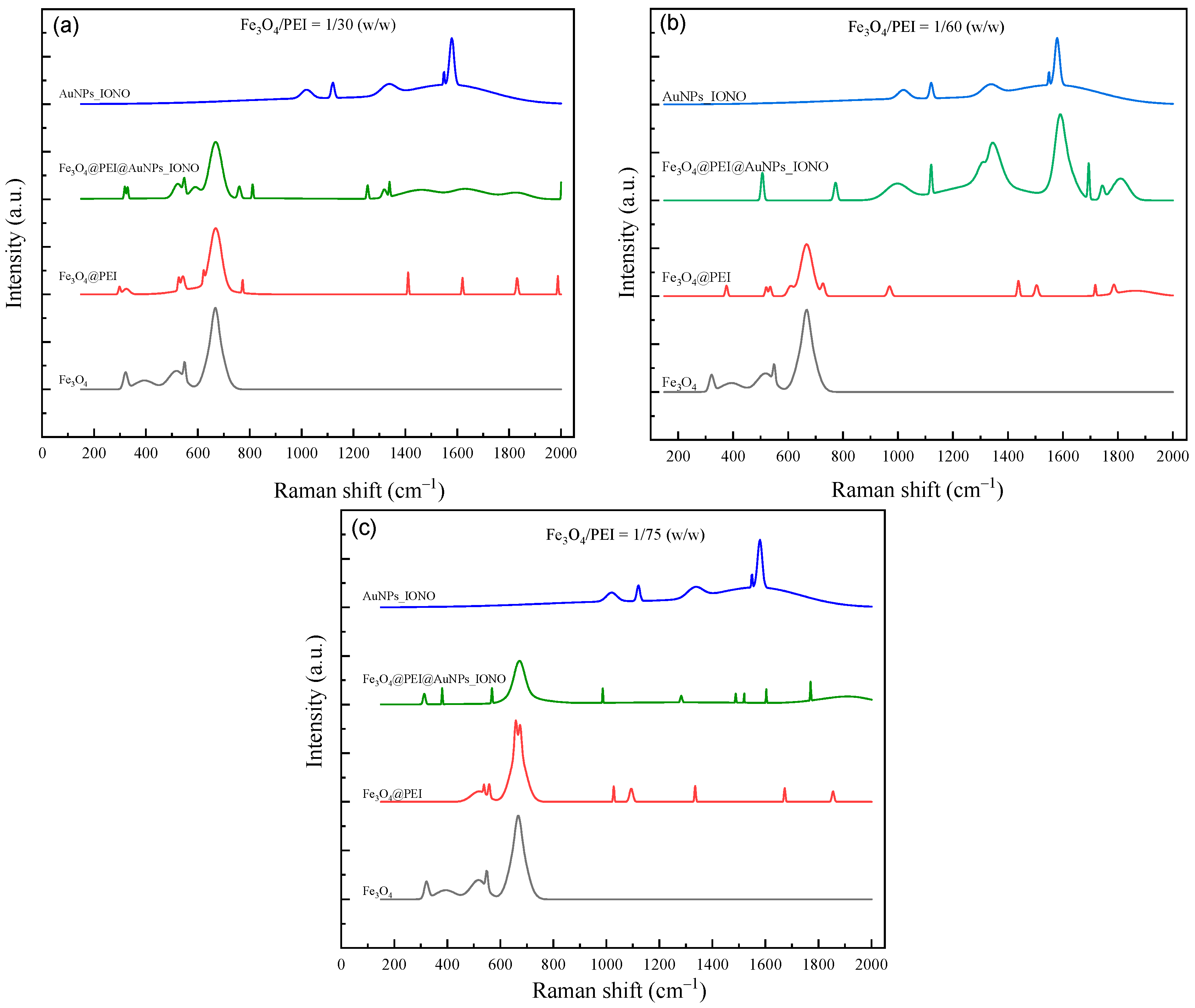 3.1. Structural Characterization of Raspberry-like Fe3O4@PEI@AuNPs and Ionophore Modification