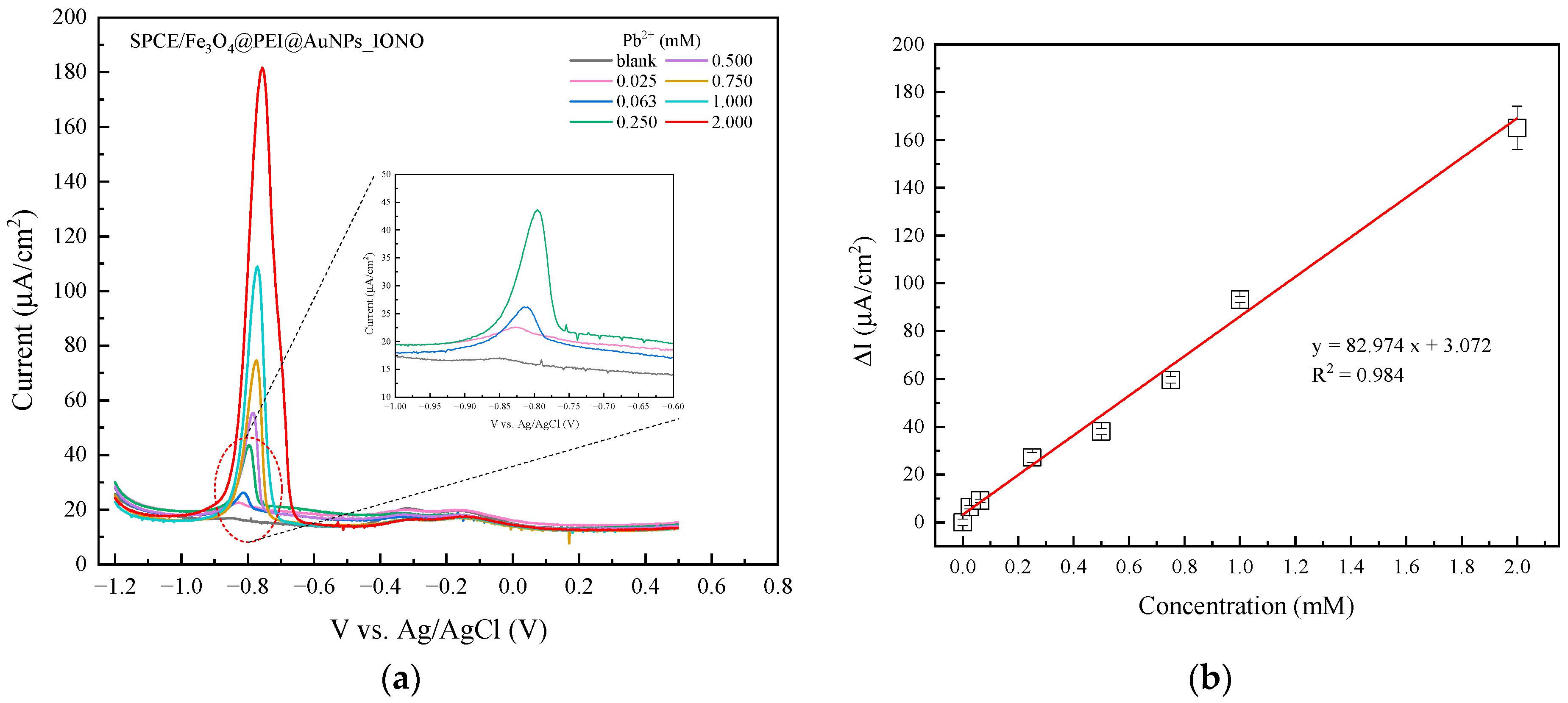 | SPCE/Fe3O4@PEI@AuNPs_IONO | Pb2+ | 11.6 ppm (0.056 mM) | 5.18–414.4 ppm (0.025–2.00 mM) | This work |